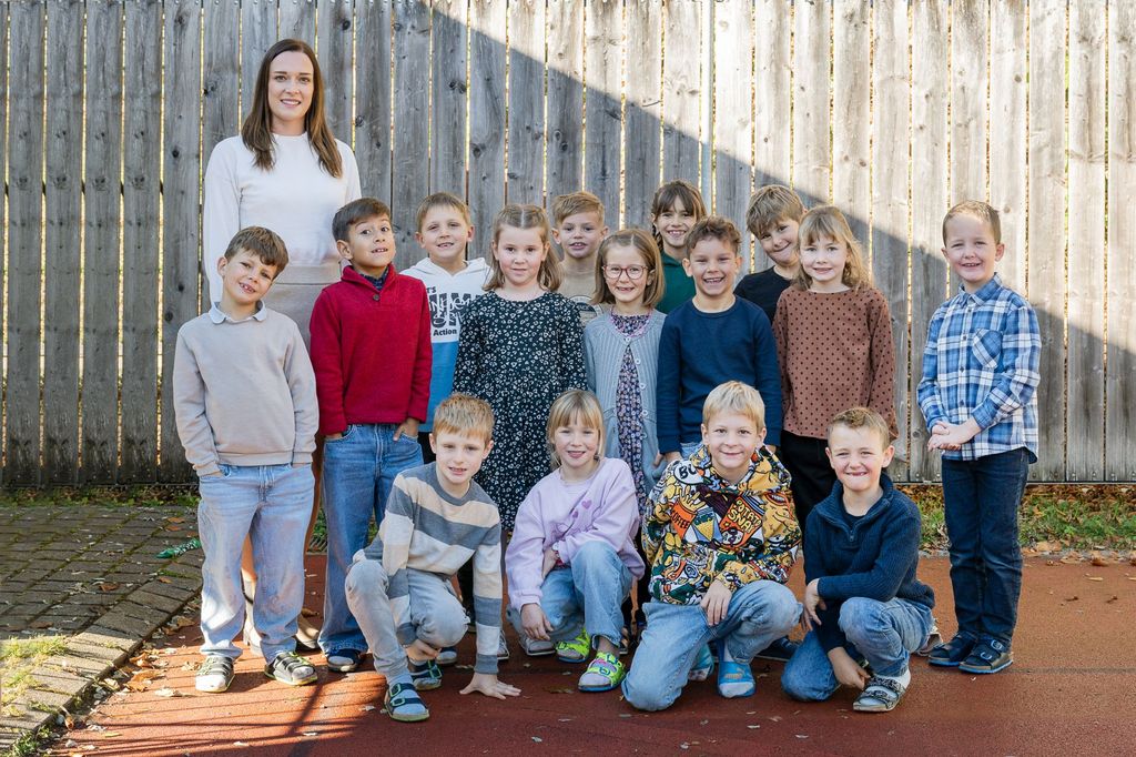 Klassenvorständin: Amanda Fink Vito, Martin, Valentin, Laura, Damian, Paula, Emilia, Theo, Jakob, Emma, Raphael Paul, Hanna, Theodor, Julian (v. l. n. r.)