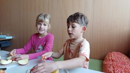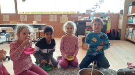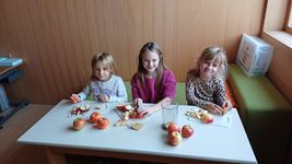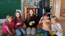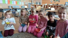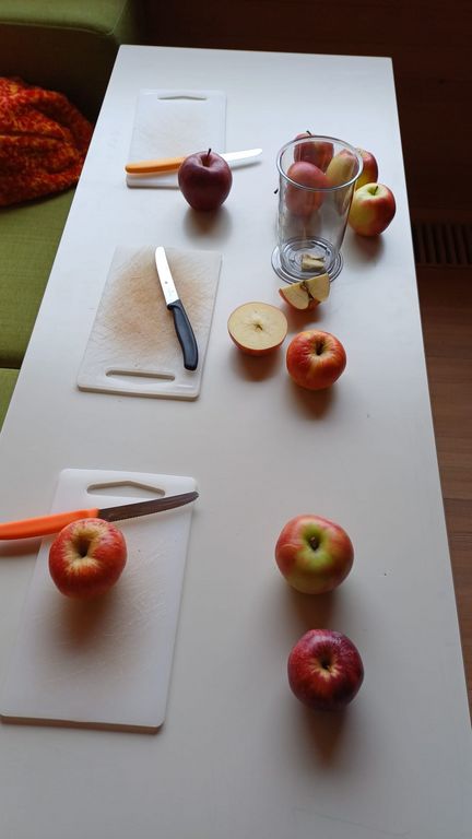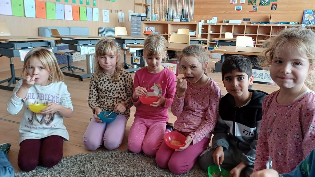 Heute duftete es in unserem Schulhaus herrlich nach Äpfeln. Schon am Morgen konnten es die Erstklässler kaum erwarten, endlich mit dem Apfelmuskochen zu beginnen. Zuerst schnitten wir die gewaschenen Äpfel in kleine Stücke und gaben sie in einen Topf mit etwas Wasser. Dann stellten wir ihn auf den Herd. Johanna, die zum Schnuppern bei uns in der Schule war, half uns dabei und hatte viele gute Tipps. Bald begann es im Topf zu blubbern, und der süße Apfelduft erfüllte den ganzen Raum. Zum Schluss schmeckten wir das Apfelmus mit etwas Zimt ab – das roch einfach köstlich! Das Apfelmus schmeckte wunderbar und wir hatten viel Spaß dabei.