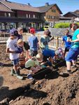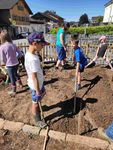 Dann ging’s an Pflanzen! Erde lockern, gerade Mulden messen und graben, Kartoffeln pflanzen und wieder Erde darüber geben. Die Kinder waren motiviert bei der Arbeit und freuen sich schon jetzt auf den Herbst, wenn wir die vielen Kartoffeln dann ernten können!
