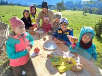 … Agathe erklärte den Kindern bei der vierten Station den Kreislauf der Natur im Laufe eines Jahres. Schließlich durften die Kinder mit Karl zu den Kälbchen im Stall – manche trauten sich sogar auf ihnen zu „reiten“.