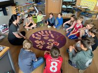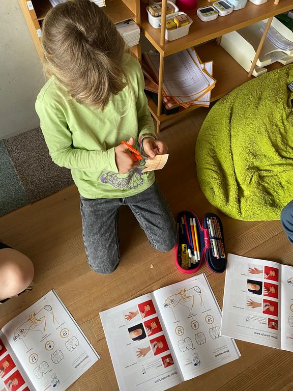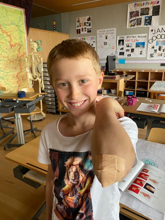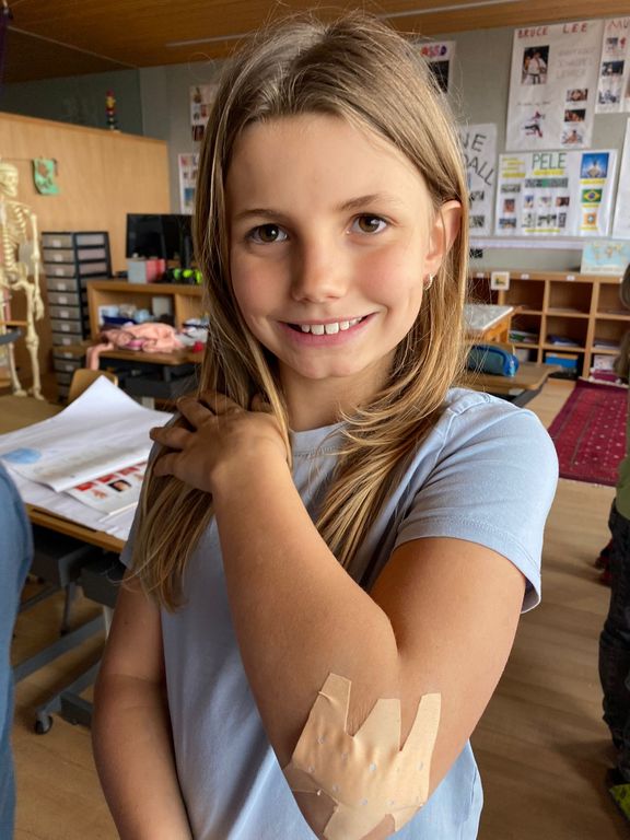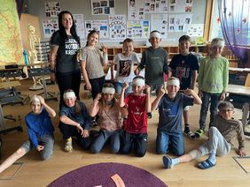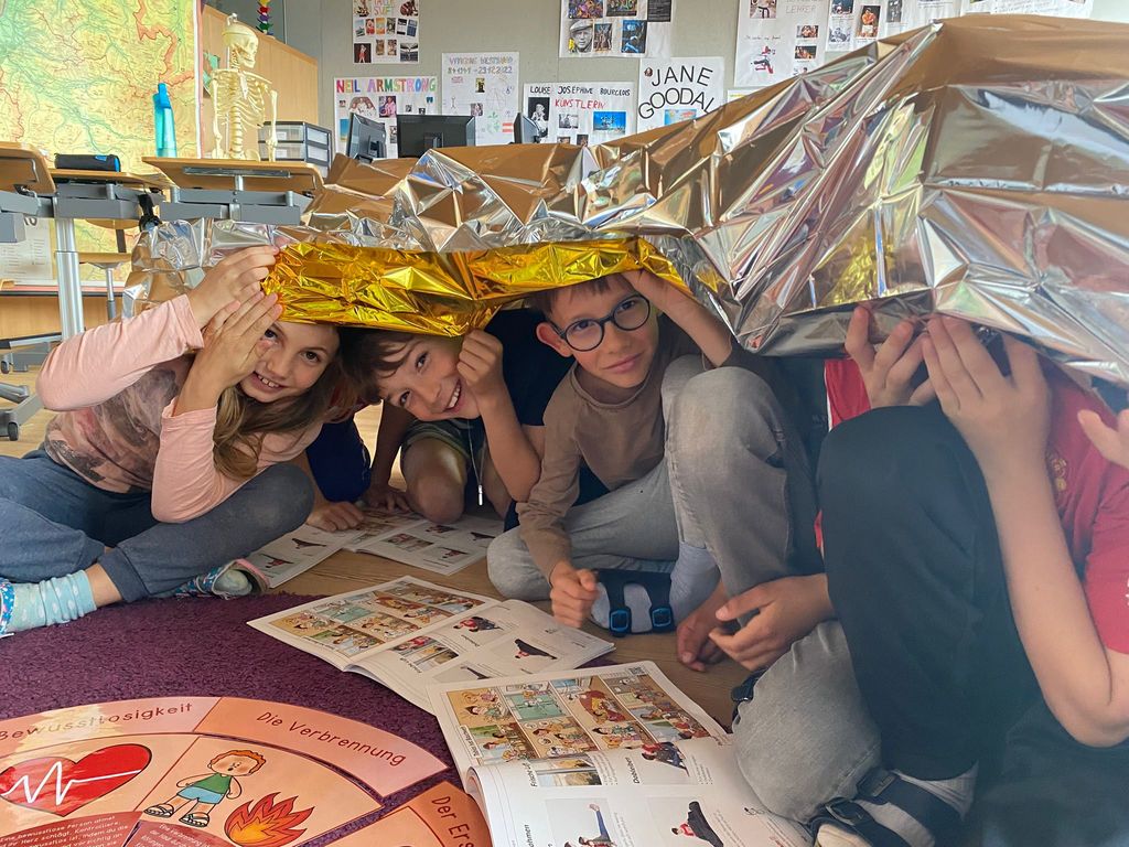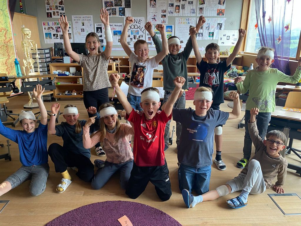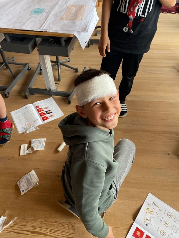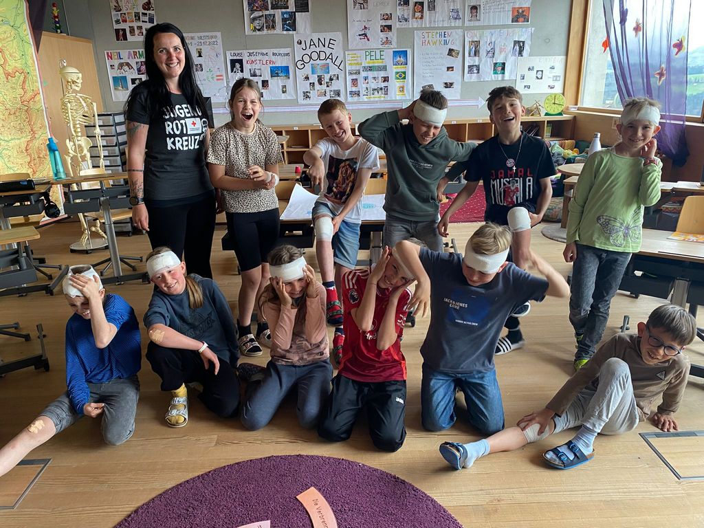 Am Dienstag, den 14.4.2026 kamen die Schüler:innen der 4. Klasse in den Genuss eines Erste-Hilfe-Kurses. Dorothe Helbock brachte den Schülern die Grundlagen der Ersten Hilfe näher. Der Kurs umfasste Basismaßnahmen, Rettungskette und Notruf und das Anlegen von Pflastern und Druckverbänden. Letzteres machte den Schülern besonders viel Spaß! Mit Verbänden an Kopf, Beinen und Armen sowie Pflastern an Ellbogen, Knien und Fingern gingen die Schüler vergnügt nach Hause… um ihren Eltern einen Schrecken einzujagen :-).