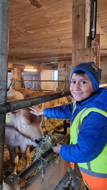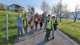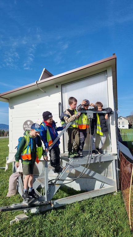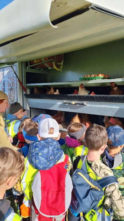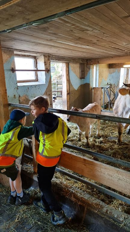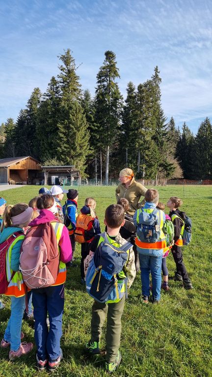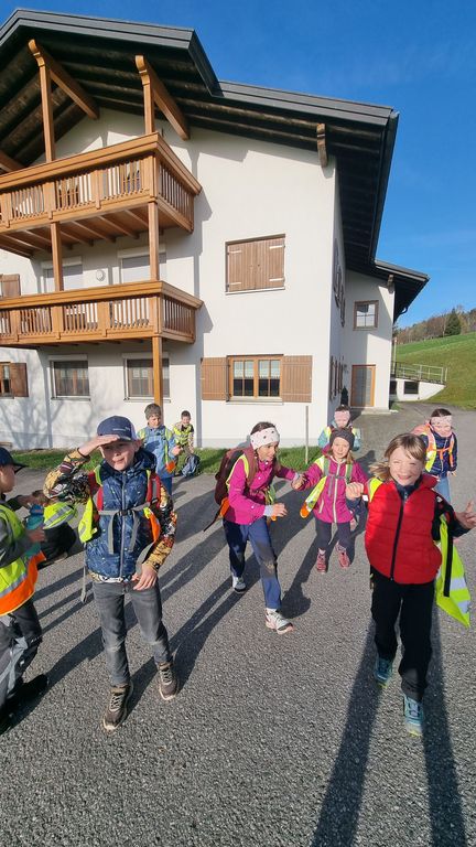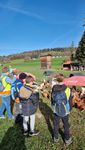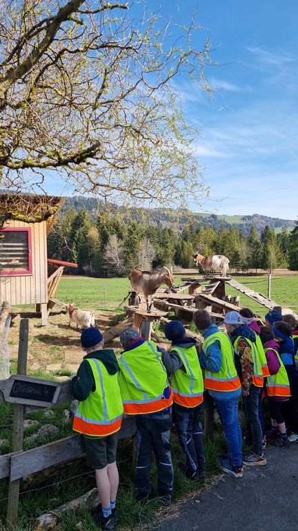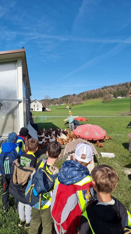 Bei herrlichem Frühlingswetter wanderten die Zweitklässler am Donnerstag, 09.04.26 zur Hühnerfarm GLÜCKSEI von Michaela und Stefan Vögel im Moos. Von Michaela erfuhren wir spielerisch viel Interessantes über Hühner, Hähne, Kühe und Kälber auf dem Bauernhof. Die zwei Hähne waren immer auf der Hut, um die Hennen mit ihrem Krähen rechtzeitig warnen zu können. Die gelegten Eier durften wir ausnehmen und in Eierschachteln schichten – bei 270 Hühnern gibt das täglich eine reiche „Ernte“.