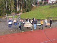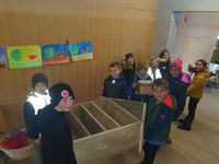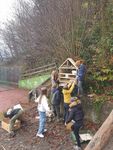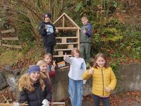 Die Viertklässler bauten im Werkunterricht ein neues Insektenhotel. Das alte hatte seinen Dienst getan und musste ausgetauscht werden. Die Kinder zeichneten zuerst zusammen mit ihrem Lehrer Elias einen Plan auf. Danach sägte die Firma Kistenbau Lingenhel die Bretter zurecht und die Kinder schraubten das Insektenhotel zusammen. Es wurde geschliffen und befüllt und gemeinsam mit dem Schulwart Andreas konnte das Insektenhotel am Dienstag, 19.11.2024 aufgestellt werden.