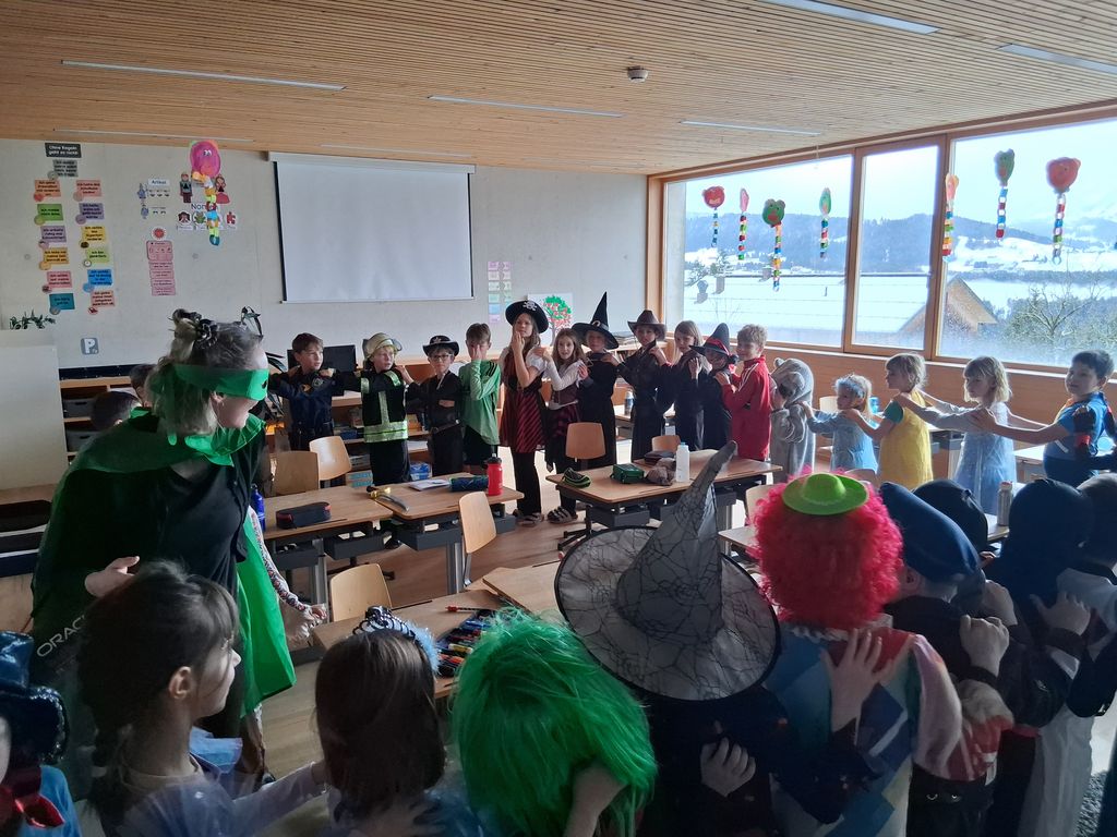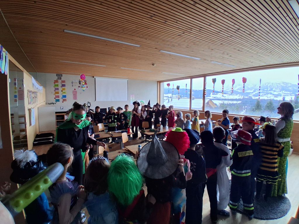 Am Rosenmontag (16.02.2026) war in der Volksschule Doren wieder ein kunterbuntes Faschingstreiben!