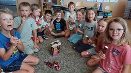 Die Klassenlehrerin Sabine las zuerst noch die letzten Kapitel des Vorlesebuches „Der Buchstabenfresser“ vor. Dazu gabs frische Kohlrabi aus dem Schulgarten und Apfelspalten. Danach versuchten die Kinder ihren 1x1-Rekord zu toppen. Juhuu, geschafft – das leckere Eis haben wir wirklich verdient!